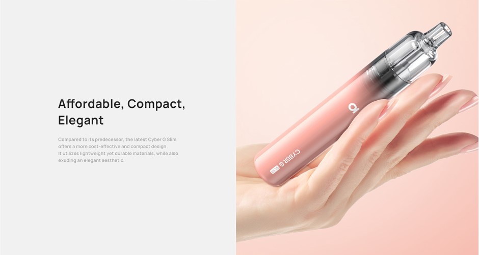Το Cyber G Slim είναι το νεότερο μέλος της σειράς Cyber, σχεδιασμένο αποκλειστικά για τους λάτρεις του MTL (σφιχτής τζούρας) ατμίσματος! Σε σύγκριση με τον προκάτοχό του (το Cyber G) προσφέρει πιο συμπαγή σχεδιασμό, χρησιμοποιεί ελαφριά αλλά ανθεκτικά υλικά, ενώ έρχεται με ανανεωμένη εμφάνιση!