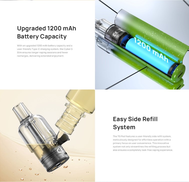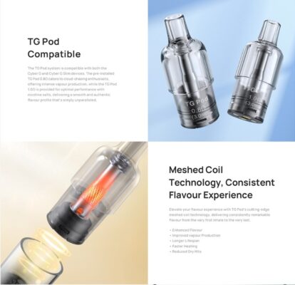Η μπαταρία έχει χωρητικότητα 1200mAh και η φόρτιση πραγματοποιείται μέσω της θύρας USB Type-C πού βρίσκεται στο κάτω μέρος της συσκευής. Τα TG Pod είναι συμβατά και με τις συσκευές Cyber G και Cyber G Slim. Το προ-εγκατεστημένο TG Pod 0.8Ω είναι για τους λάτρεις του cloud-chasing, προσφέροντας έντονη παραγωγή ατμού, ενώ το TG Pod 1.0Ω παρέχεται για βέλτιστη απόδοση με άλατα νικοτίνης, προσφέροντας ένα απαλό και αυθεντικό προφίλ γεύσης.