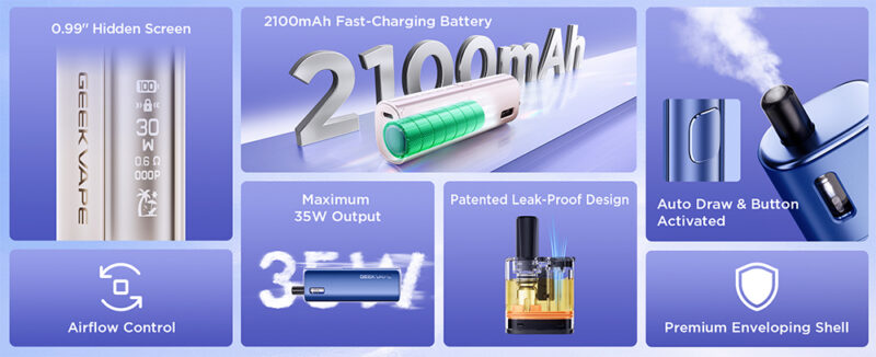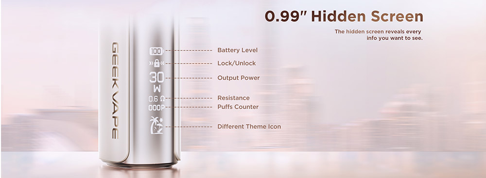 Η κομψή κρυφή οθόνη των 0,99 ιντσών, προσθέτει μια μοντέρνα αίσθηση στον είδη μοντέρνο και κομψό σχεδιασμό του. Κατάλληλο για ατμιστές που προτιμούν το MTL (Mouth-to-Lung) αλλά και RDTL (Restricted Direct-to-Lung), μιας και διαθέτει ρυθμιζόμενη ροή αέρα προσφέροντας έτσι έναν προσαρμόσιμο τρόπο εισπνοής, επιτρέποντας είτε σφιχτές τζούρες MTL είτε ελαφρύτερες RDTL.