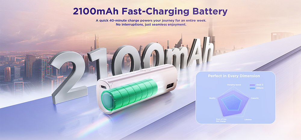 Το GeekVape Soul 2 Pod Kit, αντιπροσωπεύει μια εξαιρετική αναβάθμιση από το προηγούμενο μοντέλο συνδυάζοντας μοντέρνο στυλ, λειτουργικότητα ,εργονομία και αυτονομία. Τροφοδοτείτε από μια ενσωματωμένη μπαταρία των 2100 mAh και μπορεί να αποδώσει μέγιστη ισχύ 35W, ενώ με την γρήγορη φόρτιση USB Type-C που είναι εξοπλισμένο, επαναφορτίζει πλήρως την μπαταρία σε μόλις 40 λεπτά, καθιστώντας το μια από τις πιο αποδοτικές επιλογές στην κατηγορία του.